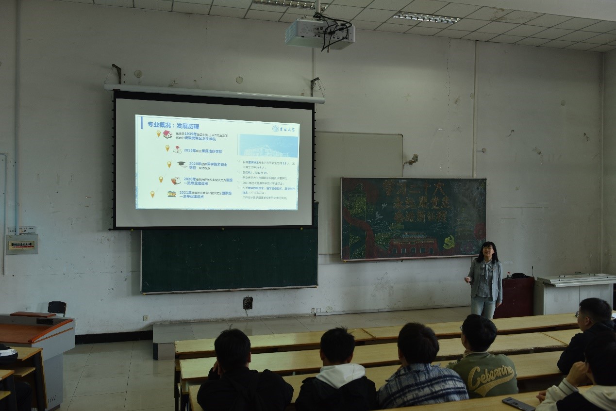 本次研究生招生宣讲由经理助理、人文教研室主任贾勇副教授和康复治疗学教研室主任赵丽晶副教授进行宣讲。两位老师分别从护理学和医学技术两个一级团队建设情况出发,就学院整体概况、专业设置、团队建设、科研团队以及招生、就业情况等进行了全面介绍。